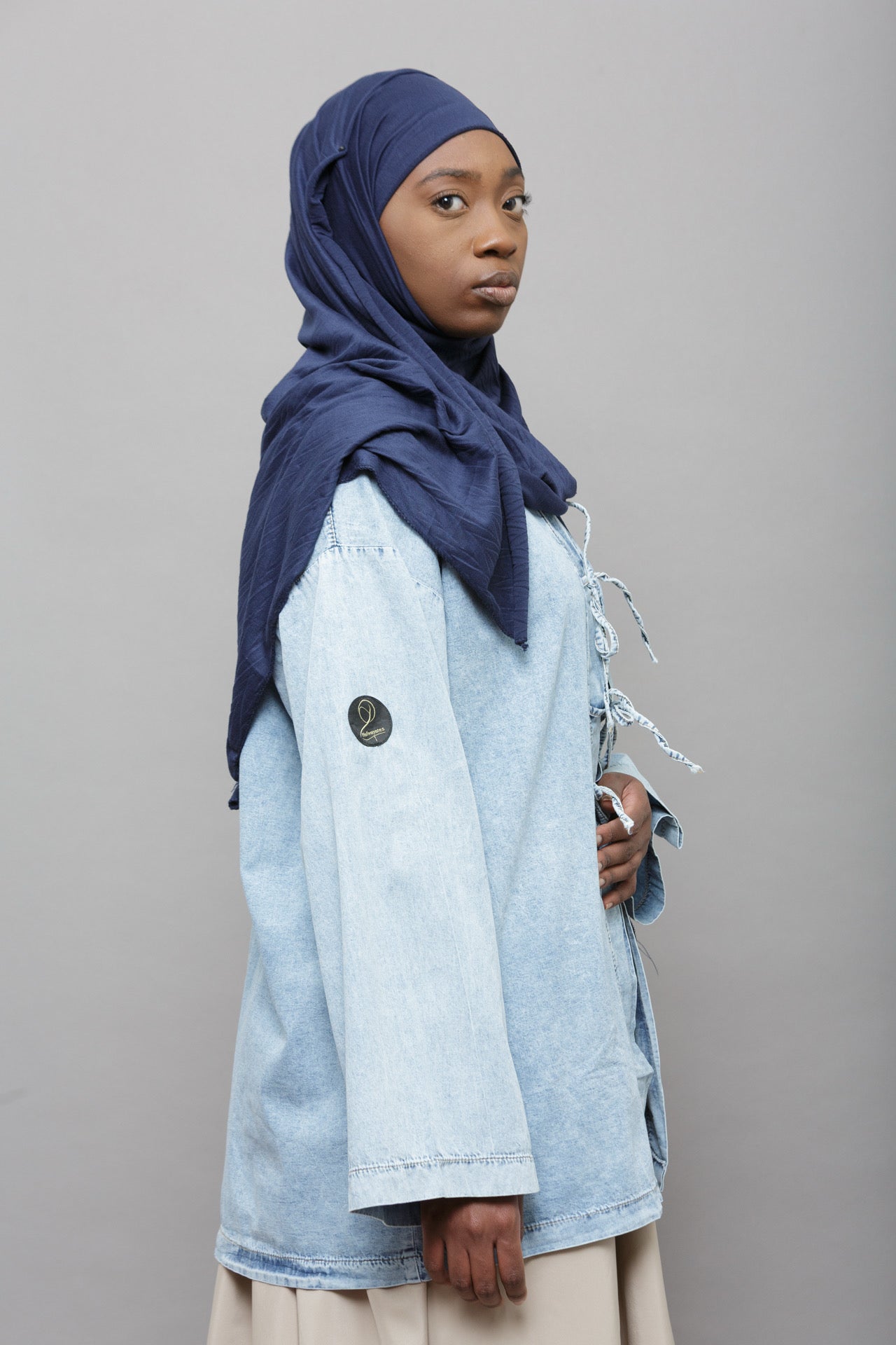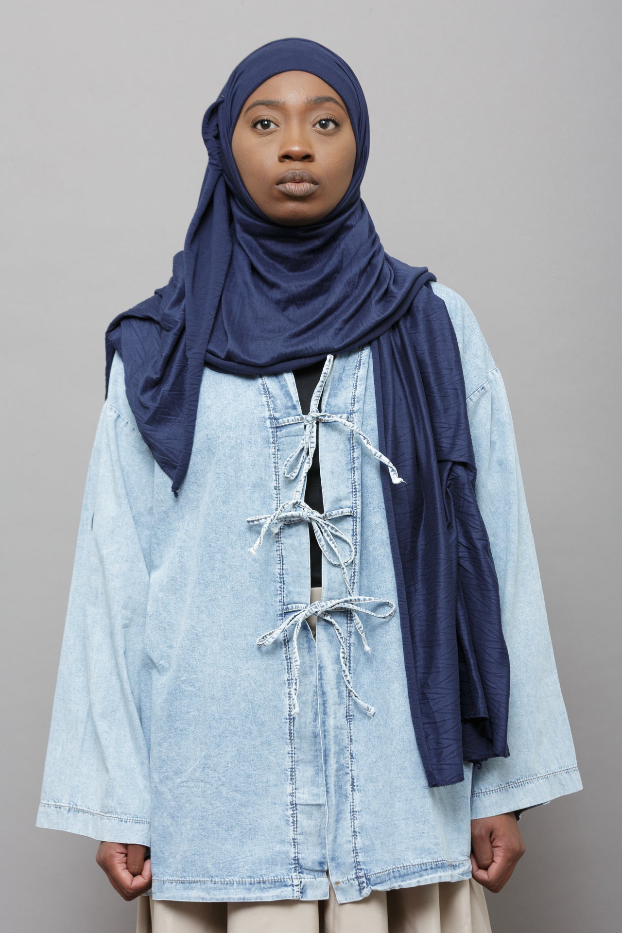 Kimono effet jean, en matière légère, noué à l’avant par trois liens.